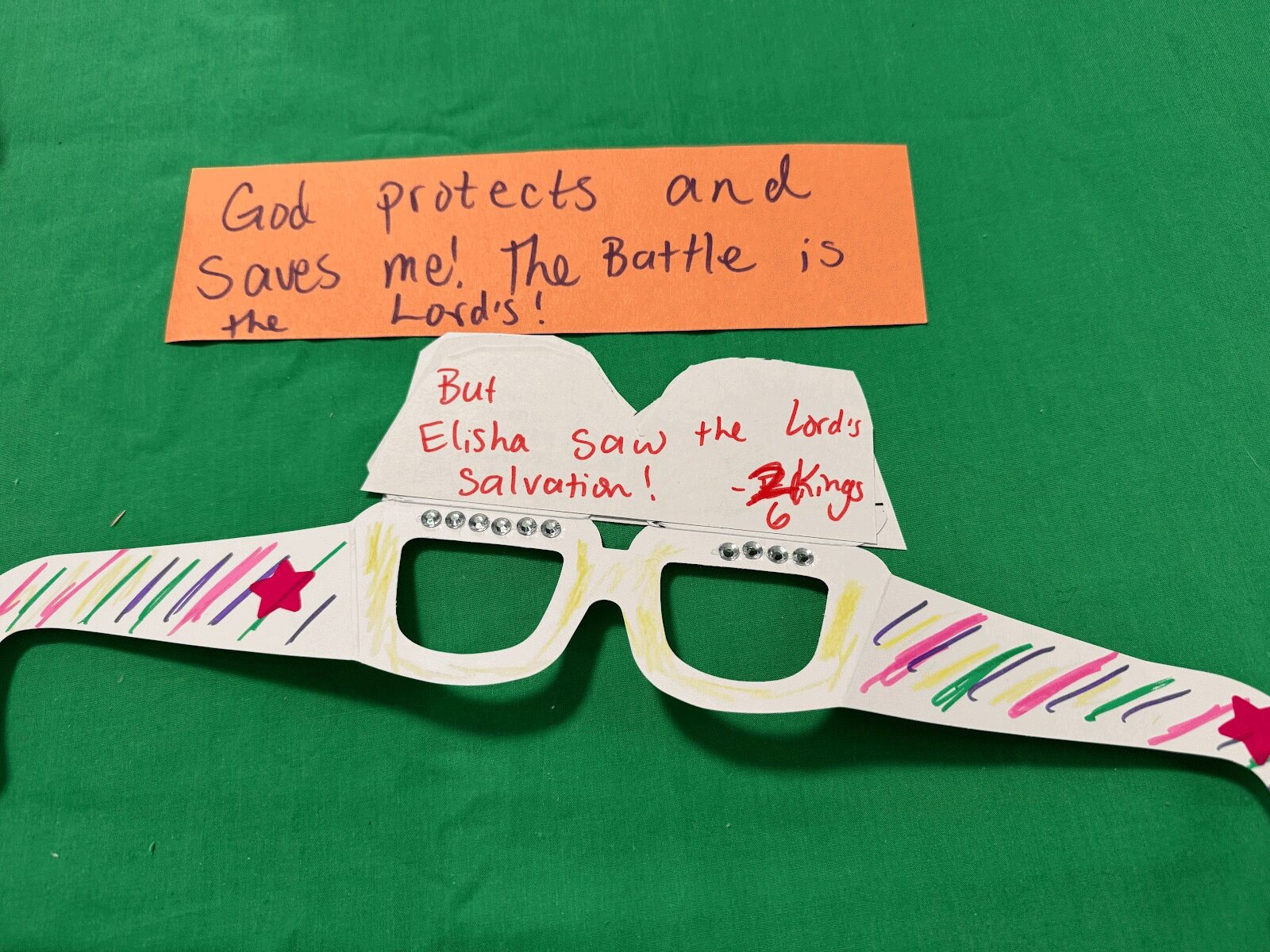 These crafts recall the events of 2 Kings 6, where the prophet Elisha was protected from Syrian forces by a heavenly army, and with God’s help, prevented attack on the Israelites, too. The account reminds us that God fights with and for us, just as He did the Israelites. A “Fiery Chariot” reminds us that God fights for us and guards us. “Blind Goggles” represent the blindness of the Syrians that came as a result of Elisha’s prayer. Let’s get crafty!