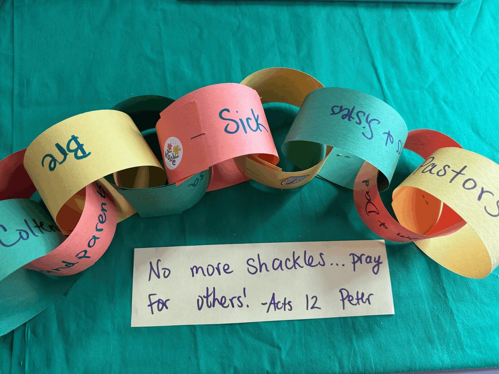 4. Use staples (or tape or glue, but staples recommended) to attach the strips to each other to make a chain. Use it to pray, and/or to reenact the story.