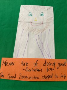 2. Decorate the reverse side of the bag to loo like the good Samaritan who stopped to help.